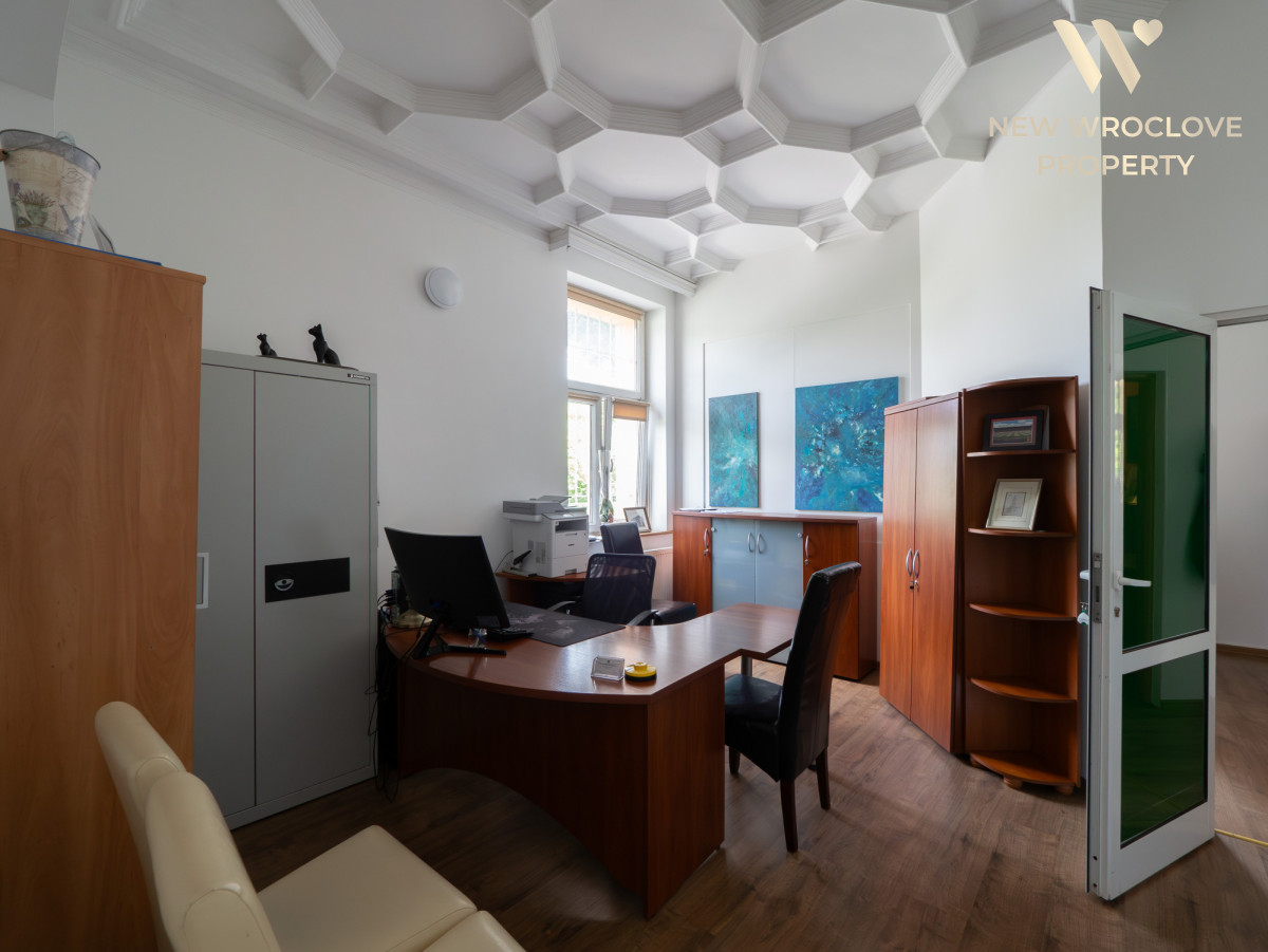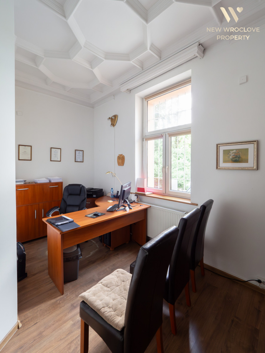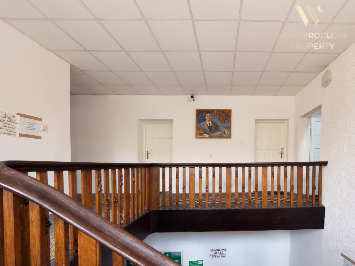 Wchodząc wejściem głównym do budynku można poczuć, że trafiliśmy w rzadko spotykane miejsce. Kamienne schody oraz zdobione bogato drzwi wita ciekawskich gości. Po wejściu znajduje się hol oddzielający lokale usługowe od schodów do części mieszkalnej. Pierwsze drzwi prowadzą do ubezpieczalni. Dodatkowe wejście od ulicy oraz oddzielone od stanowiska obsługi klienta zaplecze, pozwalają odseparować lokal od reszty budynku. Drugie drzwi prowadzą do części biurowej, gdzie znajdują się elegancko wystrojone kancelarie- adwokacka, notarialna oraz biuro rzeczoznawcy majątkowego. Drewniane parkiety, jasne kolory ścian oraz pięknie zdobiony sufit nadają stosownej w tym miejscu powagi i szyku. Całość tworzy idealną przestrzeń do rzetelnej i twórczej pracy w przyjaznej atmosferze. Oprócz wspomnianych pomieszczeń na piętrze znajduje się również pomieszczenie gospodarcze, niegdyś zaaranżowany na lokal usługowy- pralnię.