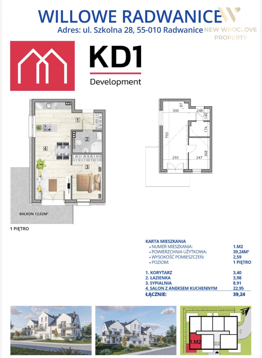 3. 1 piętro: 39,24m2 | balkon 12,02m2 | cena: 451 260 zł