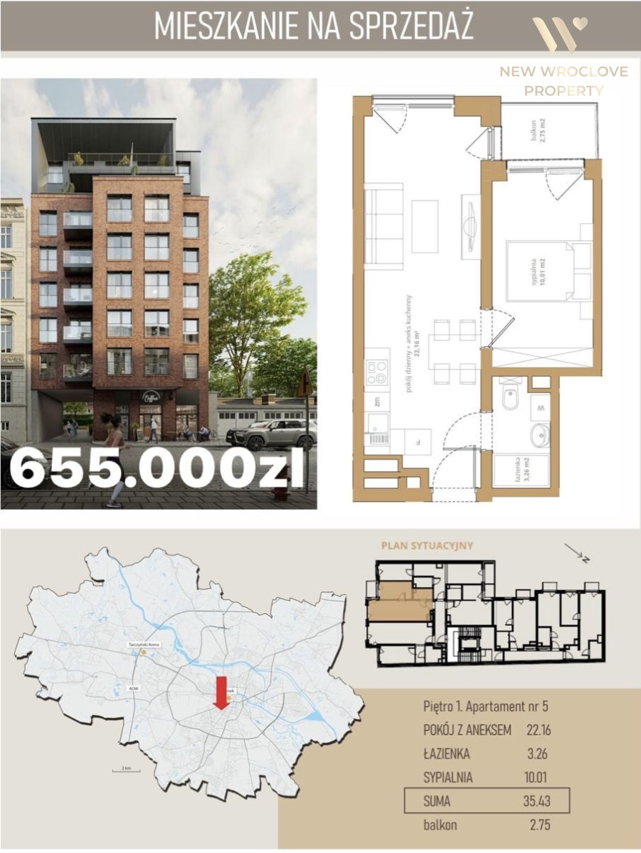 Na sprzedaż dwupokojowe mieszkanie o powierzchni 35,43m², znajdujące się na pierwszym piętrze nowego budynku przy ul. Lelewela we Wrocławiu. Lokal mieszkalny z balkonem, wyróżniający się funkcjonalnym układem i dogodnym położeniem na piętrze.
