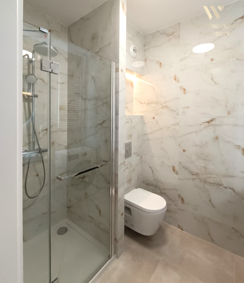 W łazience mieści się duży prysznic, wc, umywalka oraz pralka.
