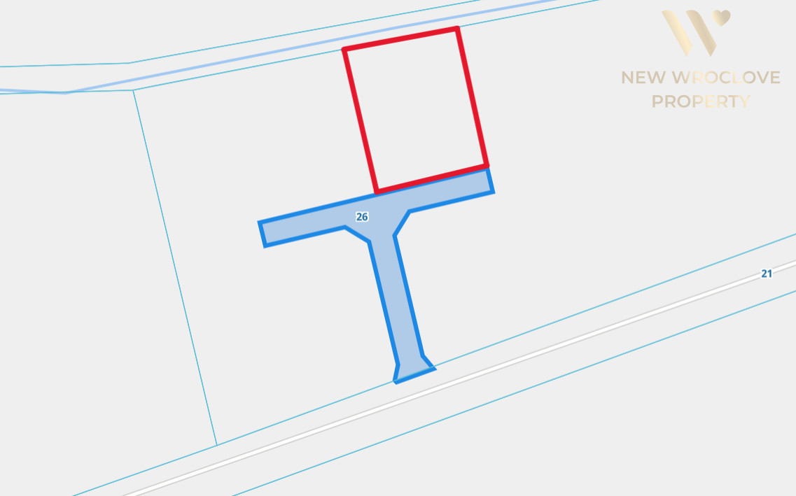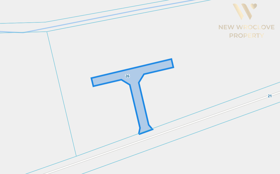 Działka ma regularny, ustawny kształt zbliżony do prostokąta, o przybliżonych wymiarach: