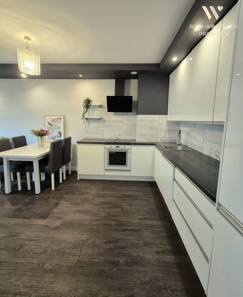 Kuchnia: w pełni wyposażona w nowoczesny sprzęt AGD i białą zabudowę w połysku.